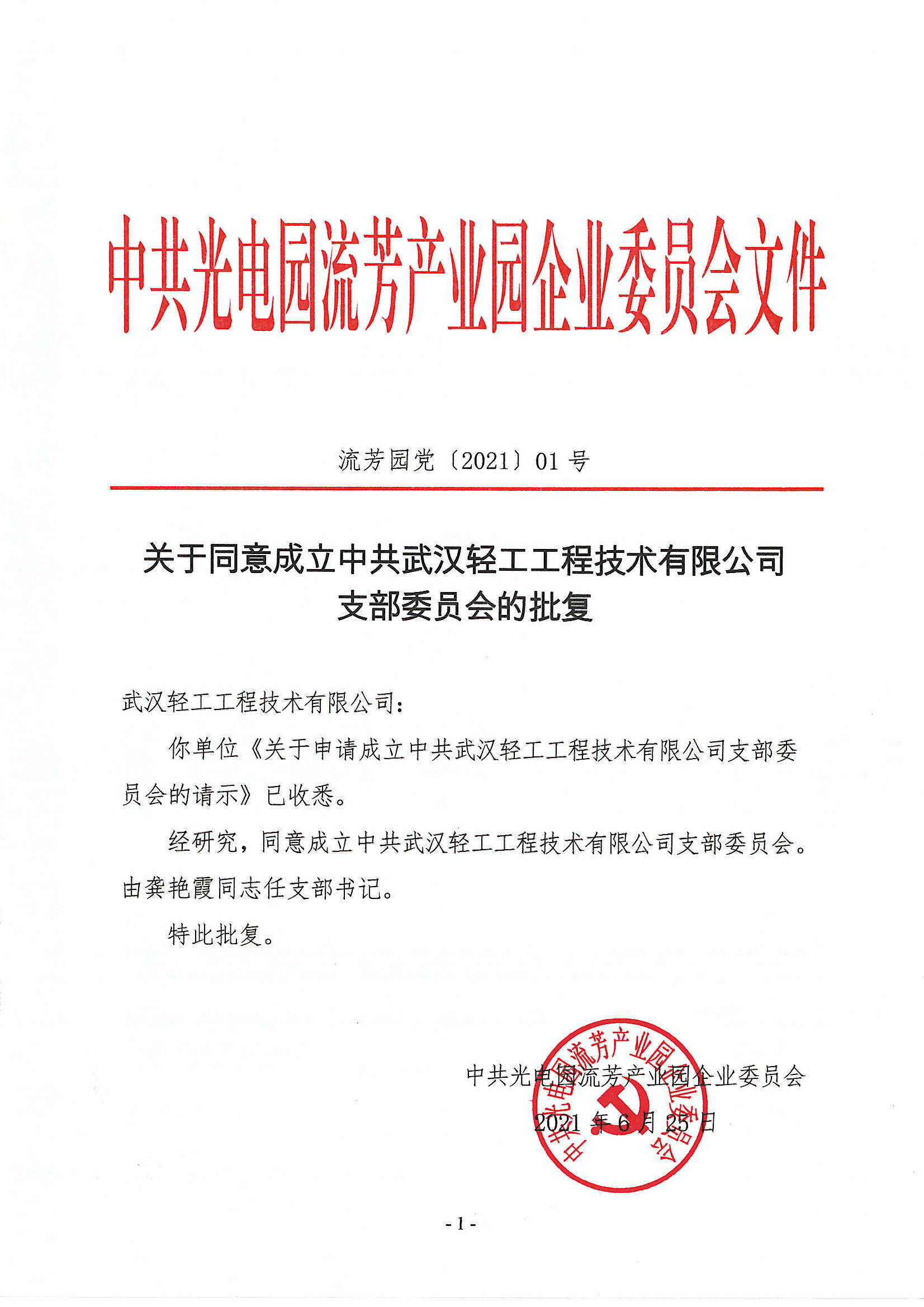 中共光電園流芳產(chǎn)業(yè)園企業(yè)委員會(huì)江峰書記宣布:經(jīng)多方面核實(shí),武漢輕工工程技術(shù)有限公司員工整體思想認(rèn)識(shí)較高,業(yè)務(wù)能力較強(qiáng),生活上相互關(guān)心,同事之間相處融洽,充分發(fā)揚(yáng)了黨組織戰(zhàn)斗堡壘與黨員在群眾中的模范帶頭作用,同時(shí)規(guī)范黨員組織生活,加強(qiáng)對(duì)黨員同志的組織管理,從而增強(qiáng)了公司員工的凝聚力;按照黨章及有關(guān)規(guī)定,結(jié)合公司實(shí)際情況,同意成立“中共武漢輕工工程技術(shù)有限公司支部委員會(huì)”。